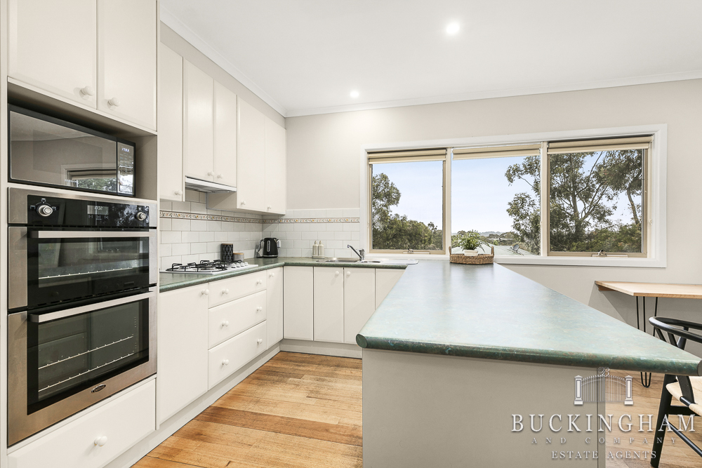 Light-filled lounge room, kitchen/meals/family zone with mountain views