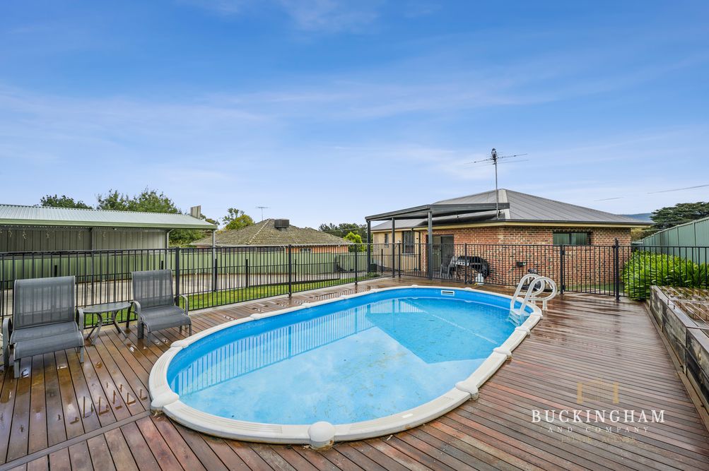 A decked pergola overlooks a serene salt chlorinated pool surrounded by decking & double pool fencing alongside grassy recreation areas, garden sheds & established greenery with a second courtyard adjoining the dining area to fire up a barbecue or fire pit.