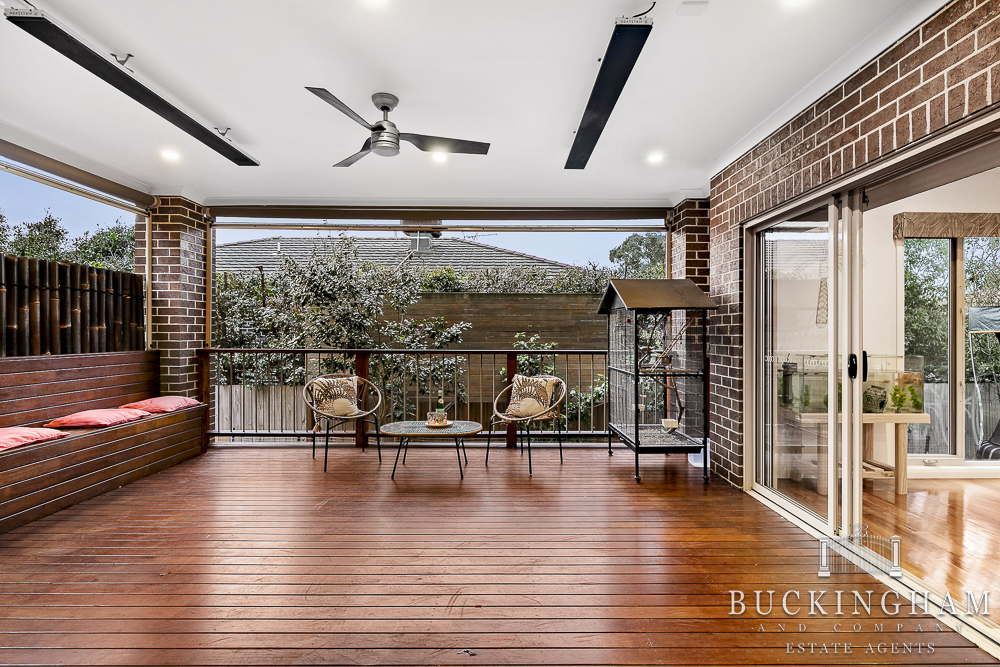 Stunning entertainer’s deck with heating/fans/blinds, easy care garden