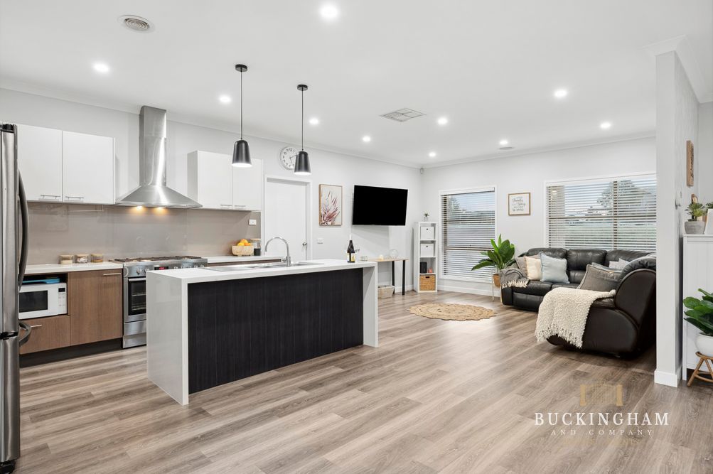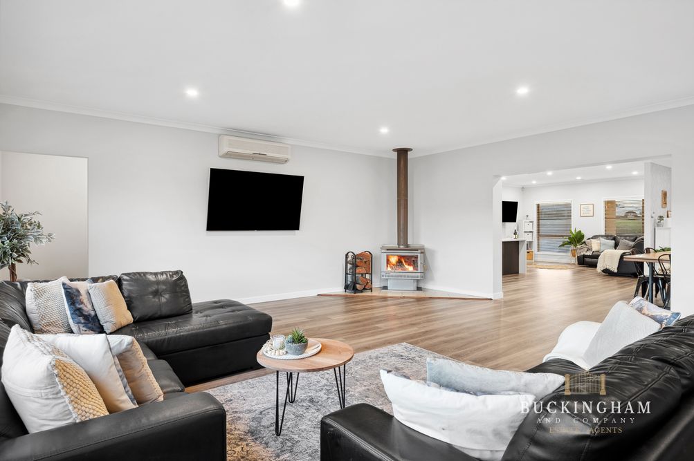 Privately nestled behind gum trees this four bedroom masterpiece can easily accommodate a changing lifestyle for years to come. Climate controlled by a wood fire, ducted heating, evaporative cooling & a split system you’ll have command of every season. Centrally located the kitchen boasts 40mm stone benchtops, NEW 900mm appliances, dishwasher & a sizeable galley walk in pantry with benchtops and cabinetry for all the modern day appliances. A versatile dining / living area allows for versatile configuration of furniture among its generous dimensions.