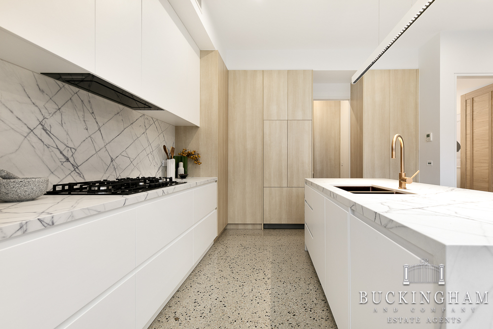 Luxury kitchen – New York palazzo quantum quartz benchtops, custom cabinetry, Miele Pyrolytic