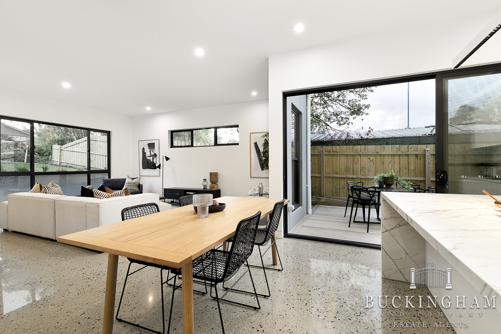 Spacious meals/living zone with deck and garden access